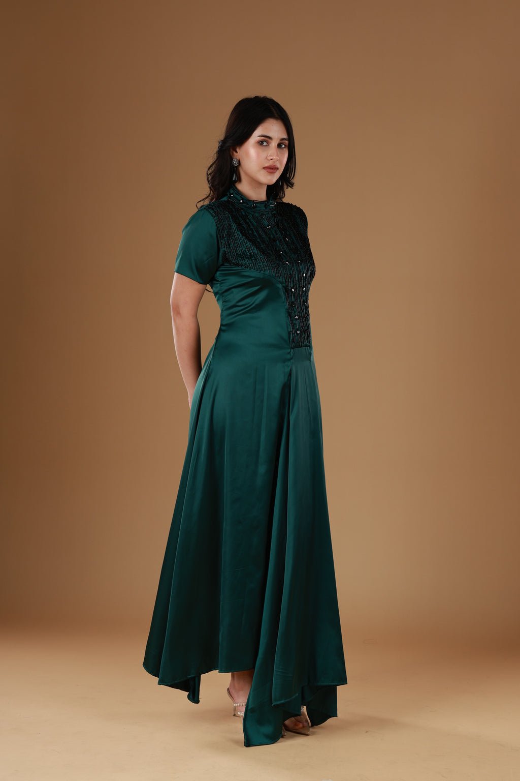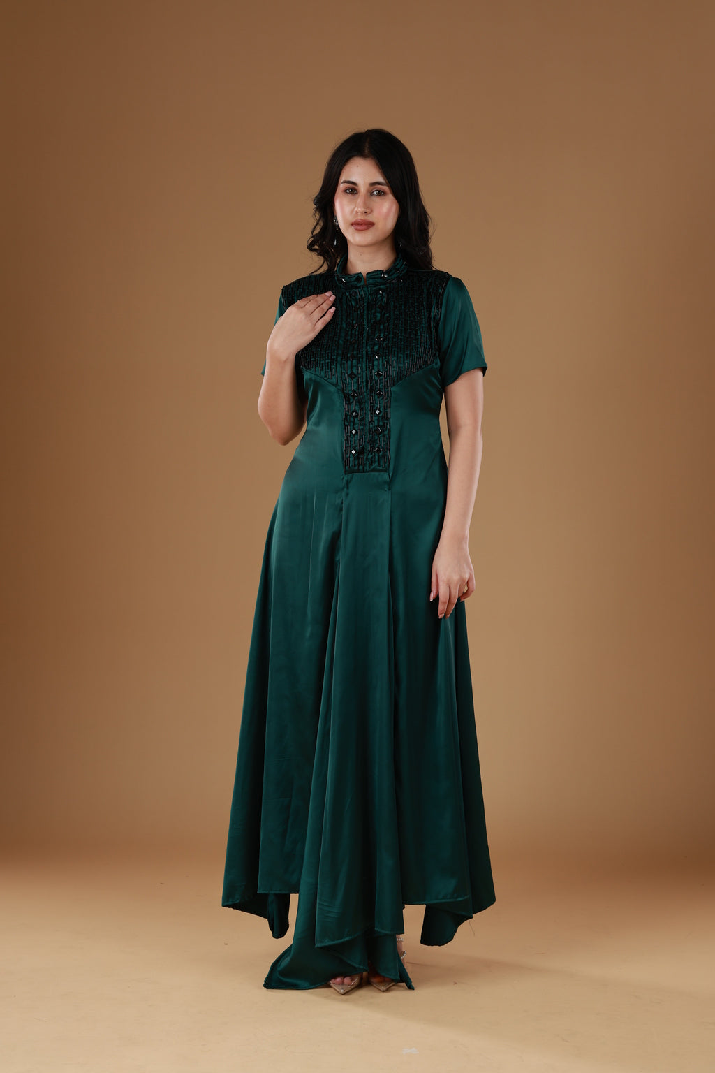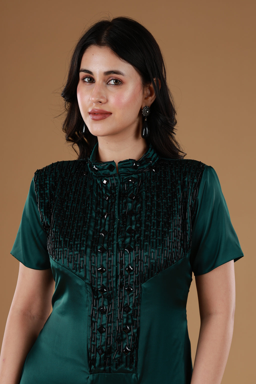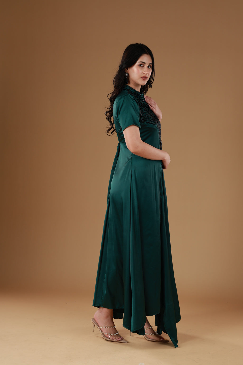 Discover the allure of Slay Official's Ebony Bottle Green Dress. Made from luxurious, bottle green satin fabric, this dress features elegant half sleeves and a flattering 52-inch height. Adorned with hand embroidery and handcut black stones, this satin drape dress exudes sophistication and timeless style. Elevate your wardrobe with this must-have piece.